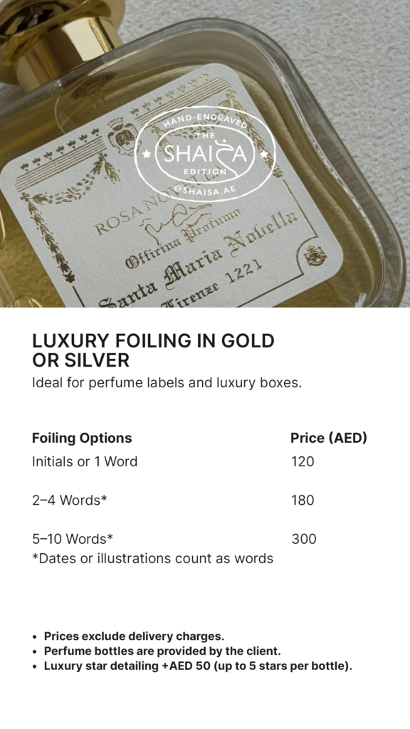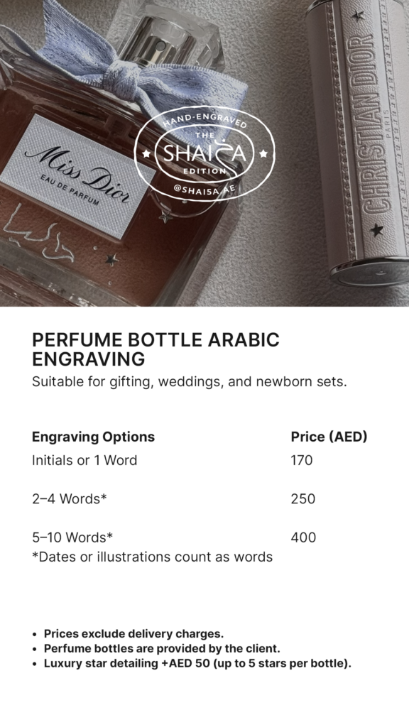 For perfume bottle engraving, items are provided by the client. Pickup and delivery will be arranged by The Shaiخa Edition.
