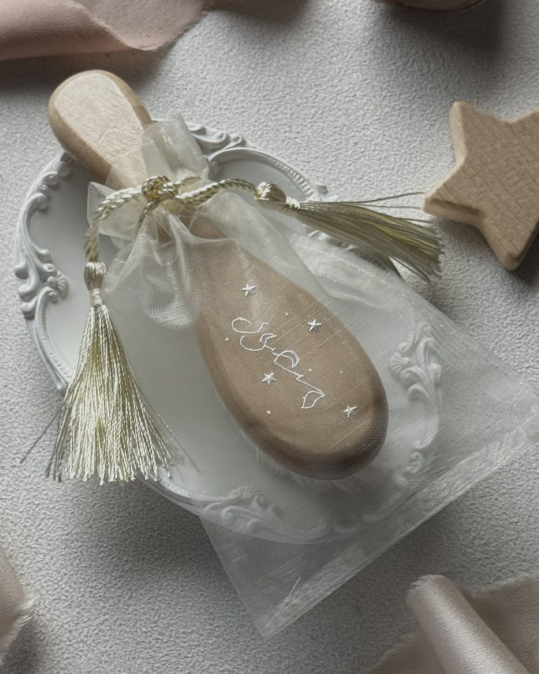 Welcome your little one with a personalized newborn brush with silver details. Delicate, gentle, and perfect for gifting.